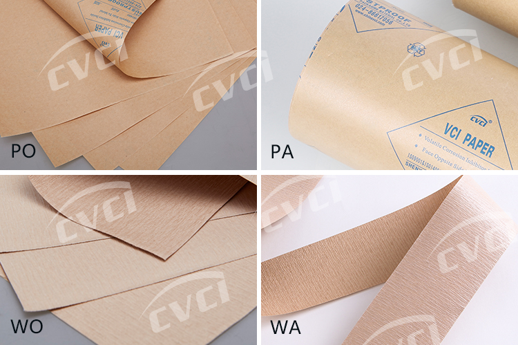 將VCI(氣相緩蝕劑)含浸與平紋或皺紋中性原紙上起到防銹目的,在中性原紙上可通過(guò)復(fù)合PE層起防水防潮目的。