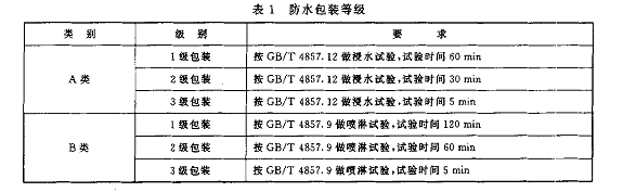防水包裝等級分為A類1級包裝、2級包裝、3級包裝和B類1級包裝、2級包裝、3級包裝,詳見表1.